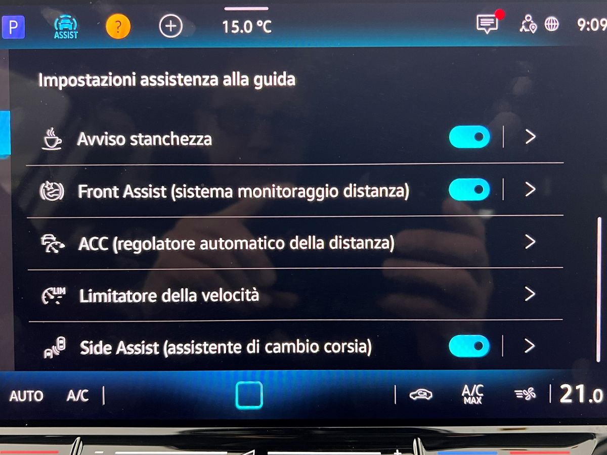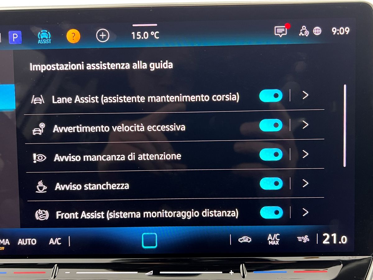 Equipaggiamento in dotazione : cruise control adattivo, retrovisore auto anabbagliante, freno a mano elettronico, illuminazione interna in 10 tonalita', ruota di scorta, bluetooth, specchietti riscaldabili e ripiegabili elettricamente, fari led ant e post con luci diurne a led, volante multifunzione a tre razze, bracciolo, sistema di ausilio al parcheggio plus (ant e post), retrocamera con area view, DRD led anteriore, digital cockpit, connessione ios e android, cerchi da 18, front assist, lane assist, blind spot, avvertimento velocita', clima automatico digitale, avviso mancanza di attenzione, riconoscimento segnaletica, fatigue detection, accensione confort, cambio al volante, keyless entry e go, sensore luci e pioggia, paddle al volante, parcheggio automatico.